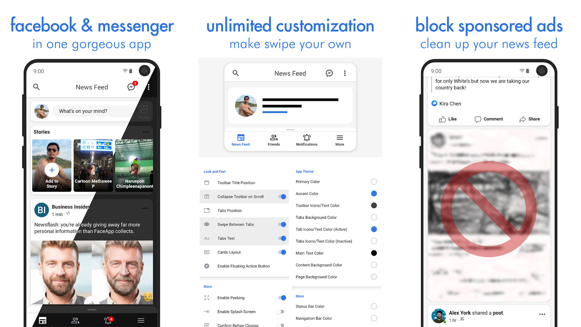 Friendly Social Browser is one of the newer Facebook apps. It has a pretty decent set of features as well. That includes theming, Facebook Messenger support, customizing your news feed, and more. You can also download videos from Facebook. The News Feed customization allows you to filter out things like keywords. That’s a great way to eliminate nonsense you don’t want to see. This is definitely among the best third-party Facebook apps. The pro version unlocks some of the features and goes for $1.99. This app is free for those who use Google Play Pass. It also supports LinkedIn, Twitter, and Instagram if you want alternatives.