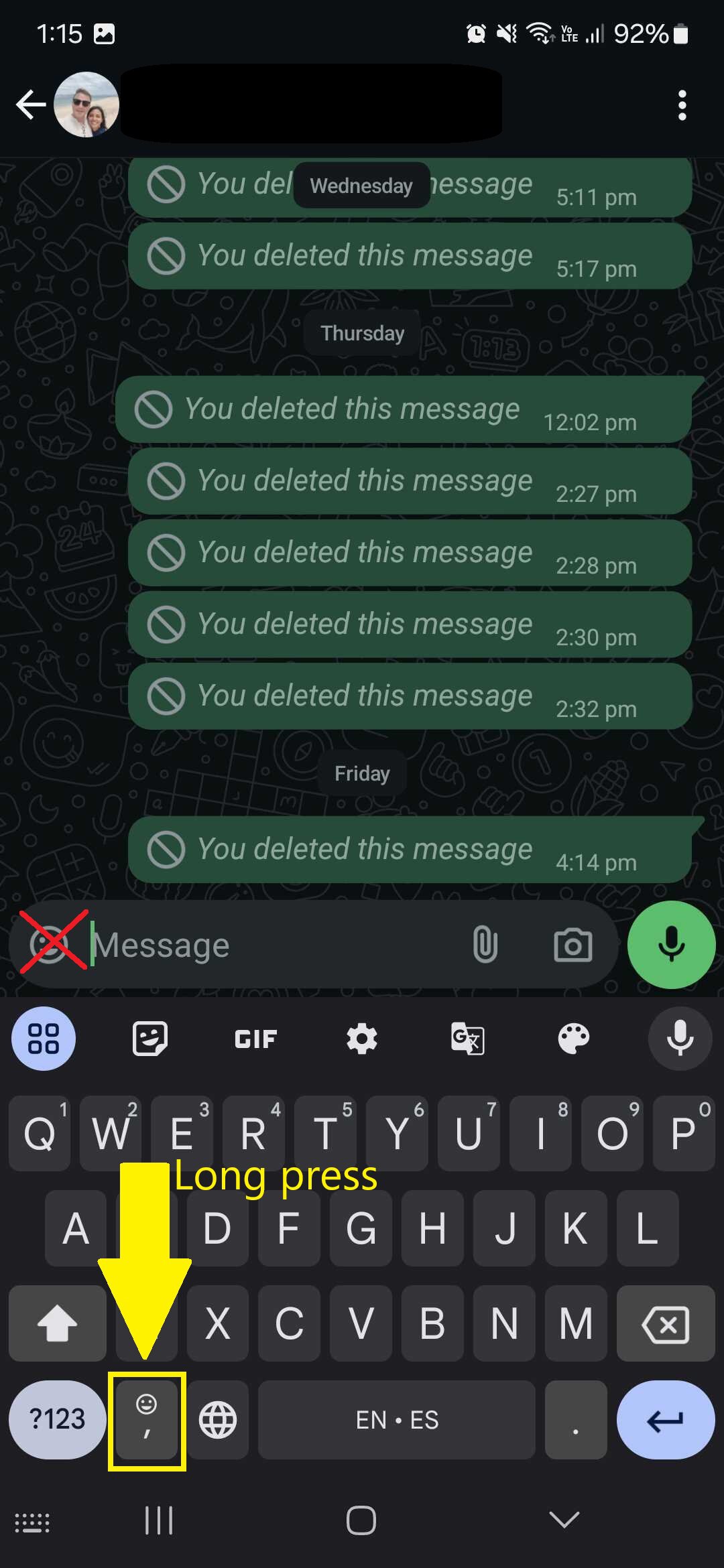 7. Go to the emoji list. Itโs important that you use the emoji list from Gboard rather than the appโs emoji list. There are a couple of ways you can do this, but the easiest way is to long-press the emoji key on the keyboard, as shown in the first image below.