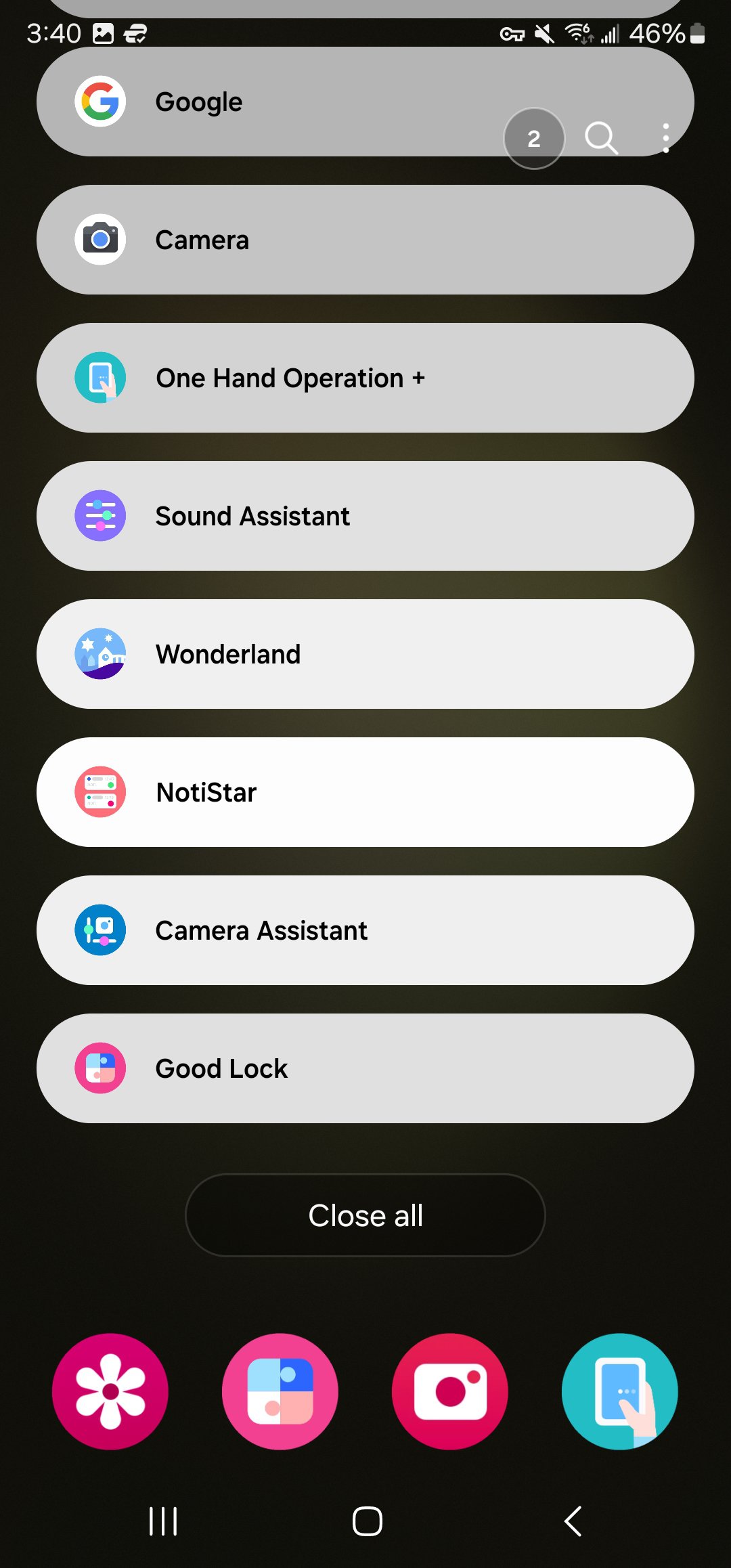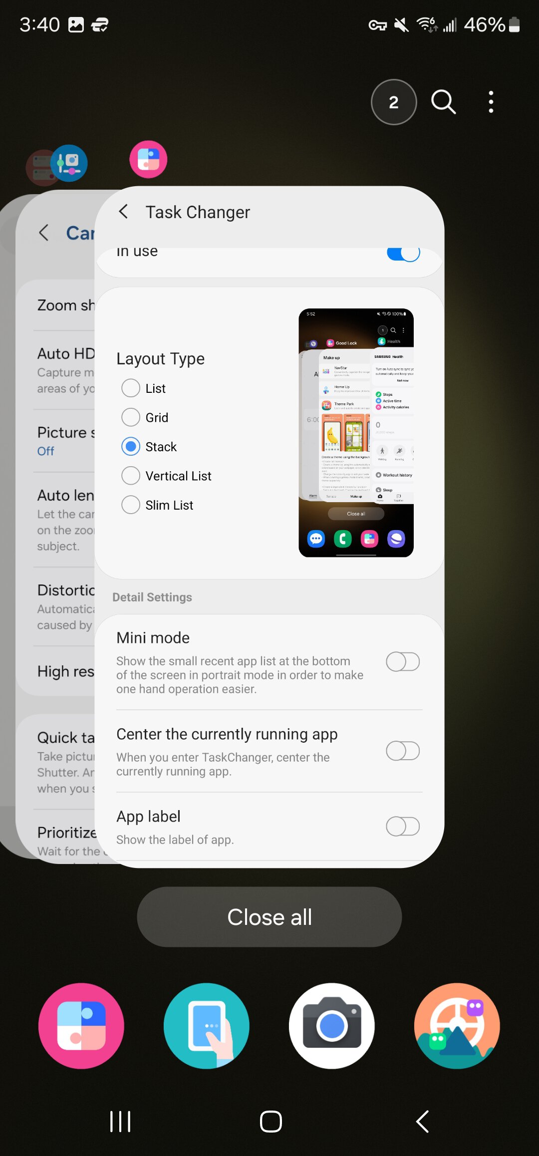 Samsung’s Home Up app lets you customize your phone’s home screen and folders, but it also lets you edit the look and feel of the Task Changer/Recents menu. You can choose one of five varied Task Changer styles — I quite like the Stack style seen in the first image — while also choosing whether or not to show app labels and the search bar in this menu.