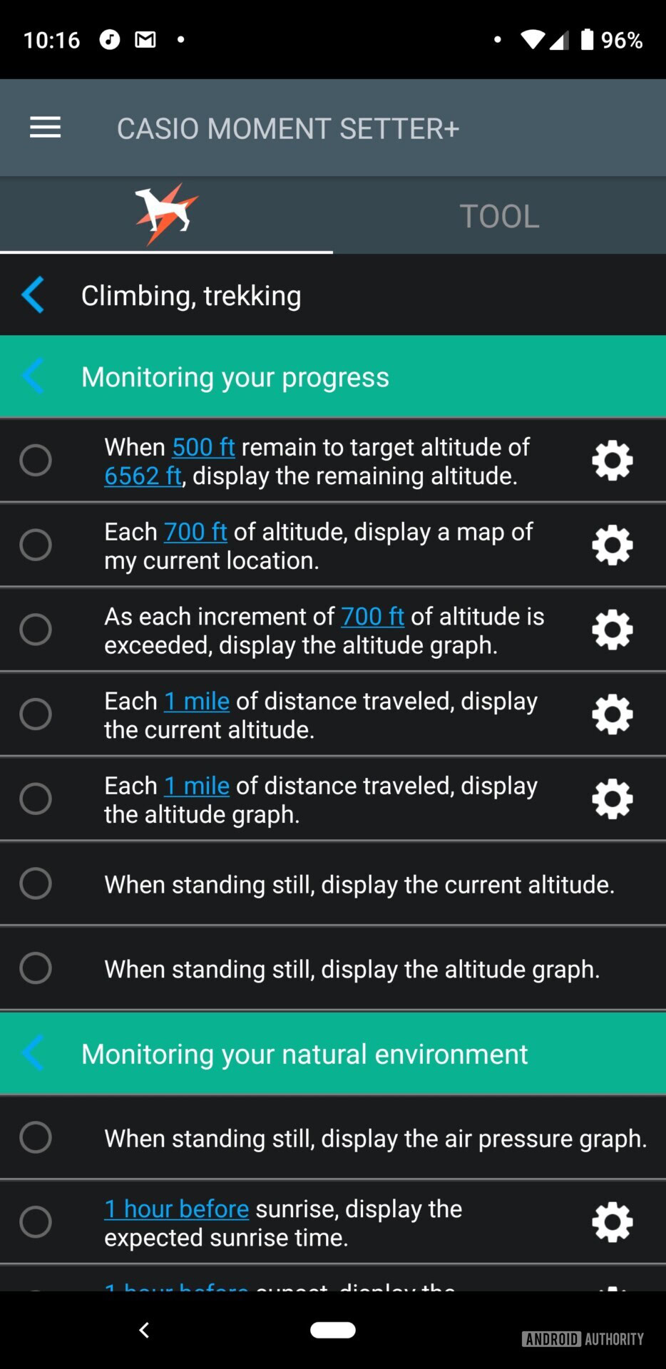 The Casio Moment app is meant to help you reach goals. Whether you’re mountain biking or kayaking, the app allows you to set specific targets, such as elevation gains, or distance traveled. These are tied to activities being monitored through the watch, such as trekking or skiing. It is easy enough to walk through the app and set goals. When you’re done, the app catalogs your activity and can export it to a PC if you want to further examine the results. The app is free to download from the Google Play Store, though it is not needed to use the watch.