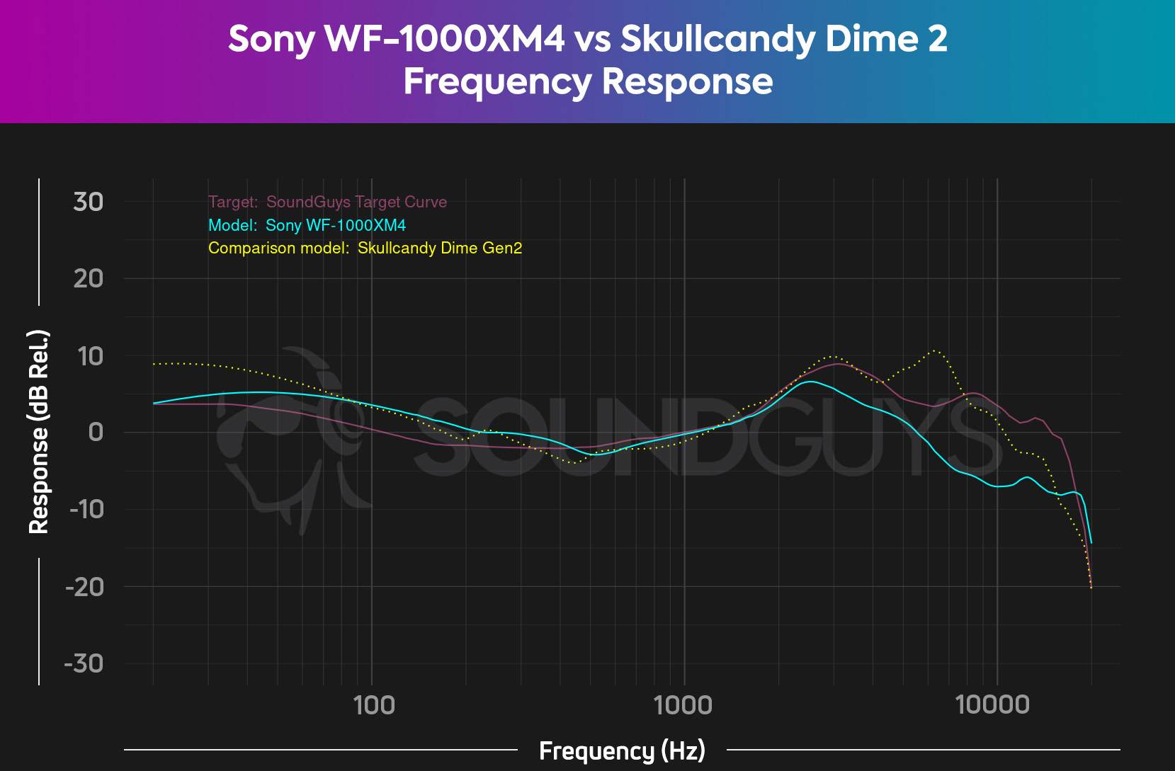 Let’s look at four wireless earbuds that cost less than $50. As seen in the charts above, the Tozo T6, Anker Soundcore Life A1, JLab Go Air Pop, and Skullcandy Dime Gen 2 all compare pretty well against the Sony WF-1000XM4. They also happen to reproduce frequencies that follow the SoundGuys Target Curve’s general shape. (For the uninitiated, SoundGuys is our audio-focused sister site.) While Sony’s bass response is tamer, the treble is unusually quiet and further away from SoundGuys‘ Target Curve than the cheap buds’ treble responses. Funny enough, the Tozo T6 actually hews closer to the Target Curve than the WF-1000XM4. What’s equally surprising: The JLab Go Air Pop frequency response mimics how studio headphones sound, more than it does consumer earbuds.