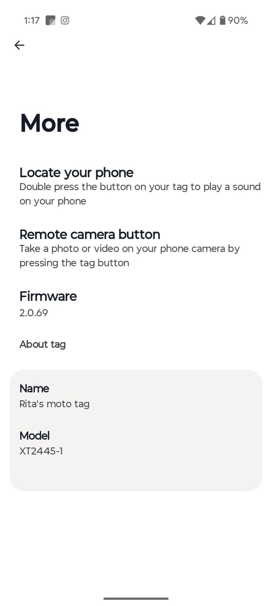With the Moto Tag, I can choose the tracker’s ringtone among four options, set up a reverse-finding feature where double-pressing the Tag’s button rings my phone (with the option to pick loudness levels), use that same button as a remote shutter for my camera app, and update the tracker’s firmware.