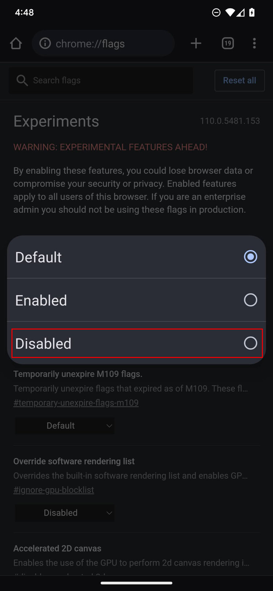 - Select the drop-down menu under the Flag you want to use. It usually reads either Default or Disabled.