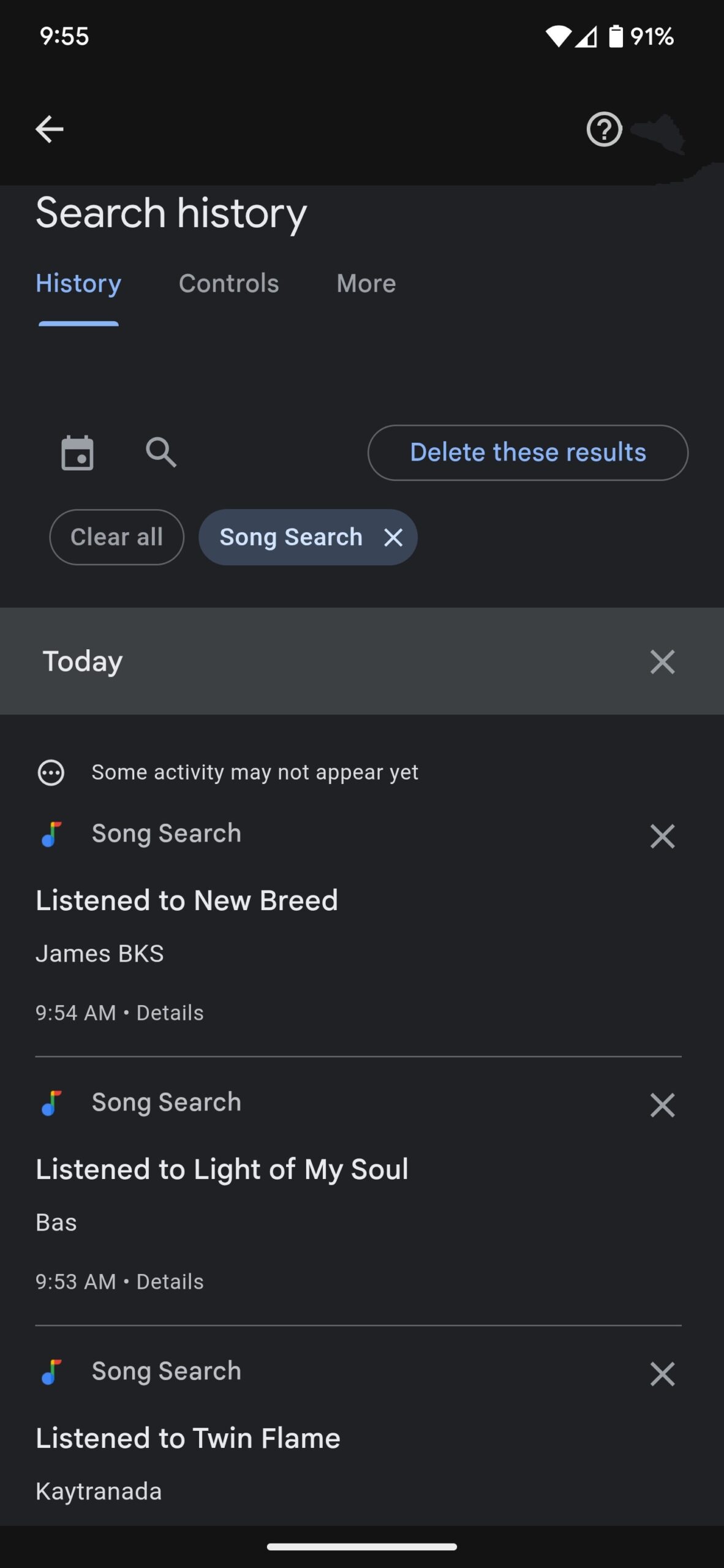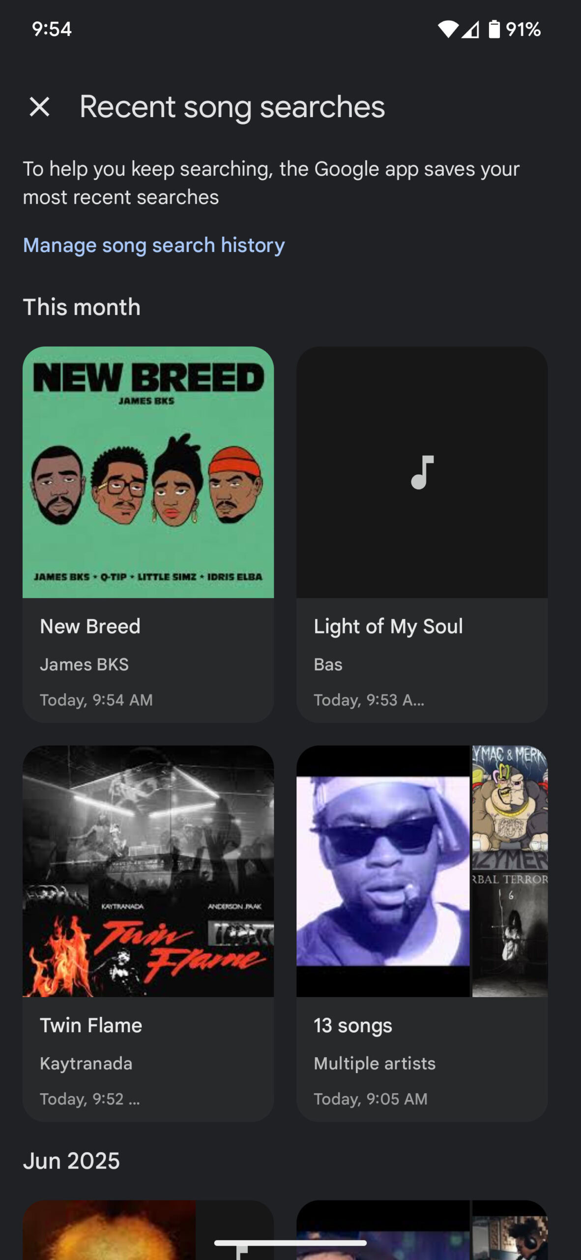 - Tapping on the new icon will open a page with your past searches, complete with song titles, thumbnails, and artist information.
