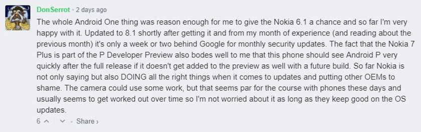 Nokia-lovers jumped to the comments section of the article with praise for the brand and the phones, but one particular commenter elevated the conversation by discussing HMD Global’s use of the Android One operating system. Check out what DonSerrot had to say below: