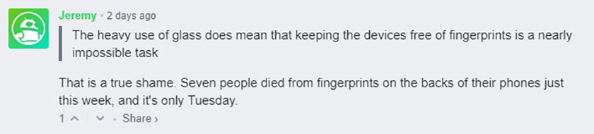 Our recent cage match between the LG G7 ThinQ and the Samsung Galaxy S9 resulted in the surprising win of the G7. But one commenter by the name of Jeremy dropped a pretty unbelievable statistic in regards to our complaint about fingerprint marks on the backs of all-glass phones: