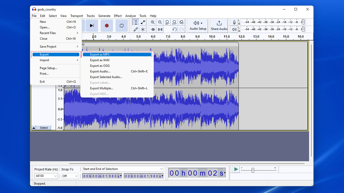 - Now go to File > Export and select your preferred format. I would use mp3.