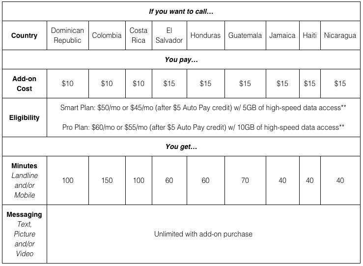 Interested U.S. customers will be able to call their family and friends in Dominican Republic, Colombia, Costa Rica, El Salvador, Honduras, Guatemala, Jamaica, Haiti and Nicaragua, simply by adding their country of choice to either Cricket’s Smart ($50) or Pro ($60) monthly plan. Pricing per month depends on which country is added on to the account, and additional texting packages can be added on from there. Take a look at the chart below for a breakdown of the pricing structure: