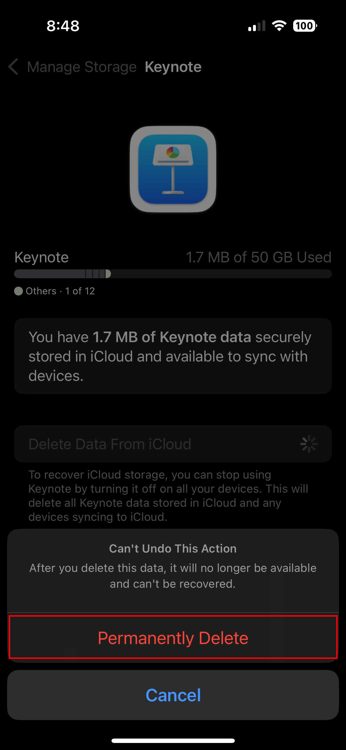 - Click on Delete from iCloud. This may show different options, depending on the app. Sometimes, you’ll get the option to Show in Finder. If that is the case, just go into the folder and delete the files manually.