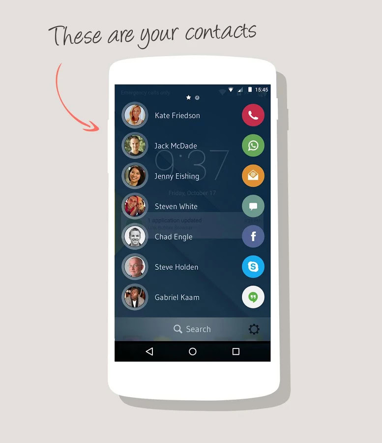 You can rotate your contacts view between recently contacted and favorites, and you can change which order your apps are displayed on the right. If you can’t find a contact on your list, just click the search bar on the bottom of your screen. And probably the most overlooked feature of this app is just using it for launching apps more quickly. Once you launch drupe, click on an application and you’ll be thrown right into it.