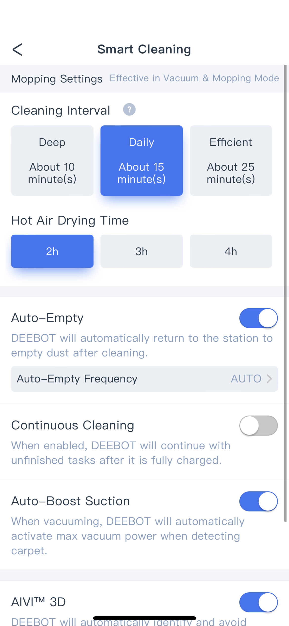 If you’re not bothered about settings and schedules, you can hit “Auto Cleaning” in the ECOVACS app and the robot will start cleaning whatever floor it’s on as completely as possible (based on whether you’re in vacuum or mopping mode). At least occasionally, however, you’ll want to tap “Enter Smart Cleaning” and swipe up the card at the bottom of the screen to access cleaning preferences.