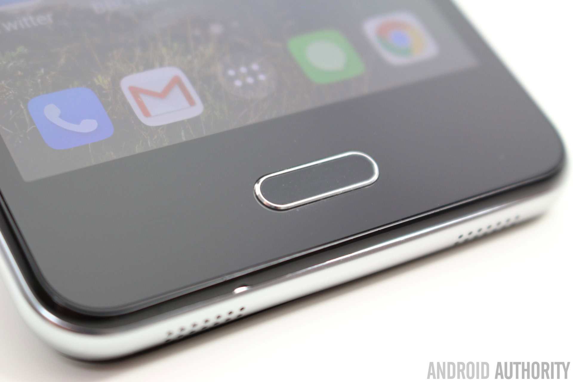 On the front is the 5 inch , full HD display, the front facing camera, and a set of capacitive keys which flank the home button. The capacitive keys light up when pressed. The home button also houses the built-in fingerprint reader.