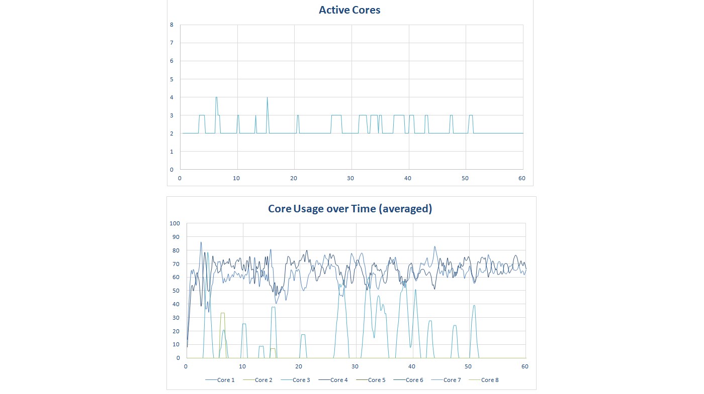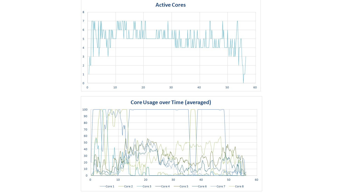 So what about an octa-core? Will it show the same pattern? As you can see from the graph below, no it doesn’t. Seven cores are consistently being used with the occasional spike to 8, and a few times when it dips to 6 and 4 cores.