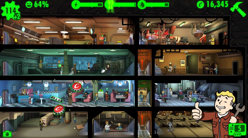The other game set within the same post-apocalyptic world is Fallout Shelter, a smaller, more intimate game designed for touchscreen devices that puts the player in the role of an overseer, whose job it is to build, and maintain a subterranean shelter and look after civilians following a nuclear detonation.