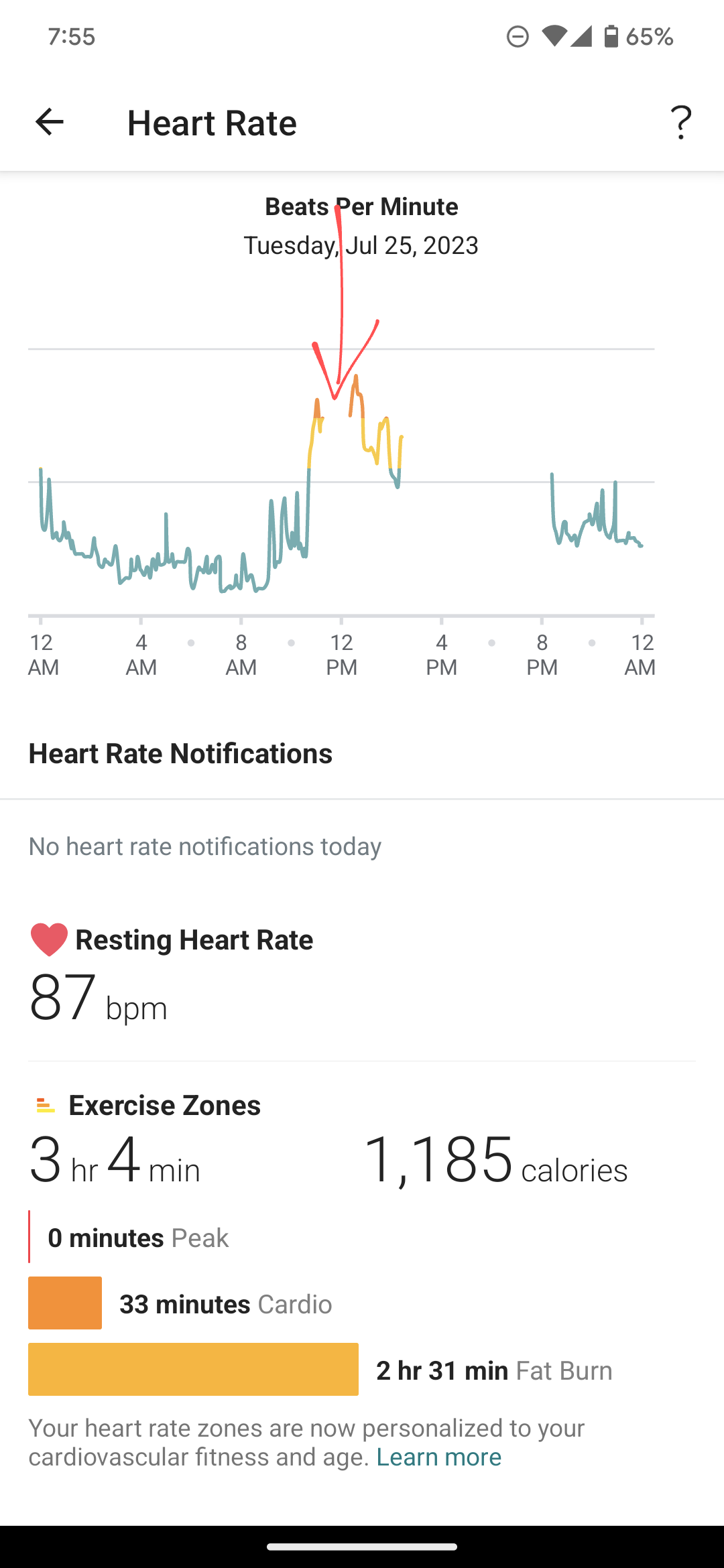 Another quite telling proof is that heart rate data during the swim is completely missing from the day’s graph too. Check the screenshots below. I went for a swim around noon on Tuesday, July 25, and Thursday, July 27. Heart rate data is notably missing during those exercises (pointed out by the red arrows), so there is no way for me to tell how intensely I swam. At all.