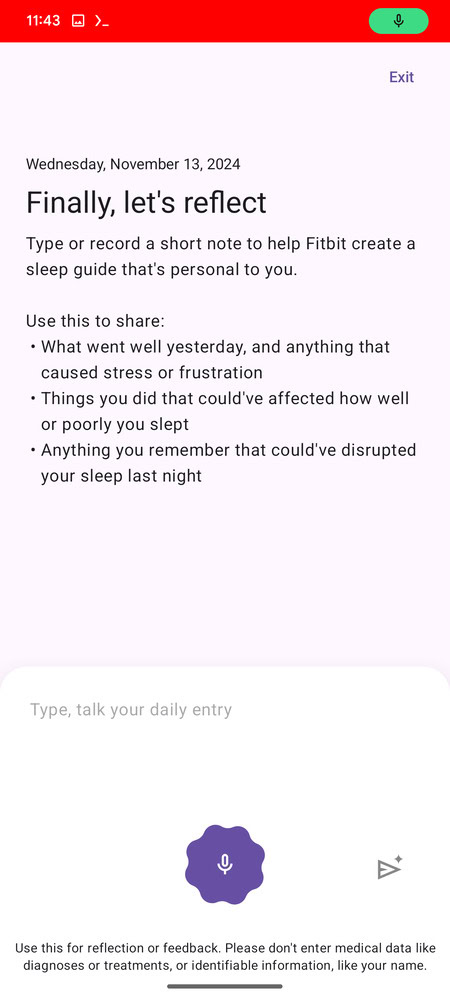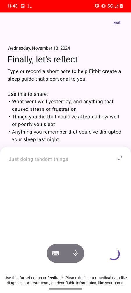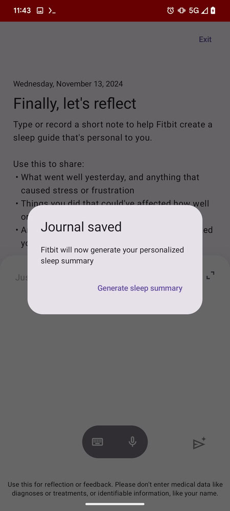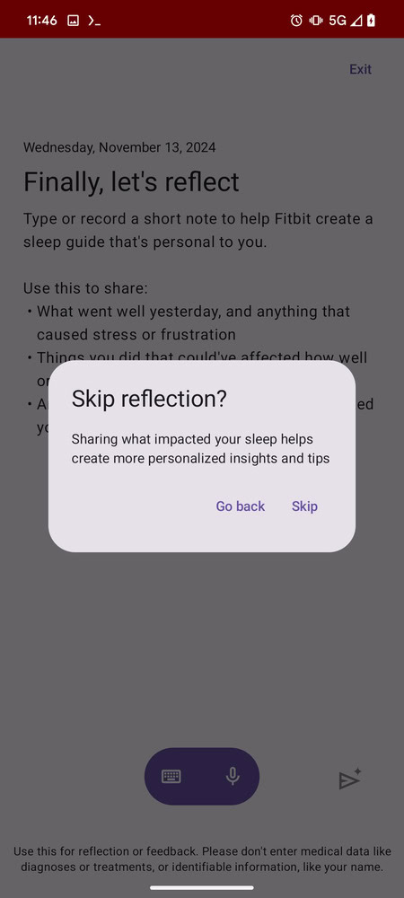 The feature mentions, “To get deeper insights and more personalized suggestions for better sleep, complete your journal each day.” If you don’t submit an entry, a reminder pops up saying “Sharing what impacted your sleep helps create more personalized insights and tips.” You’ll then have the option to “Go back” or “Skip.” If you do fill out your entry for the day, Fitbit will generate a personalized sleep summary. By the sounds of it, this will be an AI-powered feature.