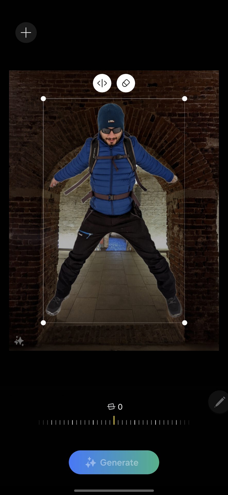 First, when you select any object or person, you can not only move, remove, and resize them, but you can also rotate them on the Galaxy S24. Google doesn’t offer that. Here’s the photo of my husband jumping in the snow, but rotated sideways and upside down. I could get into a lot of shenanigans because of this editing option. I love it.