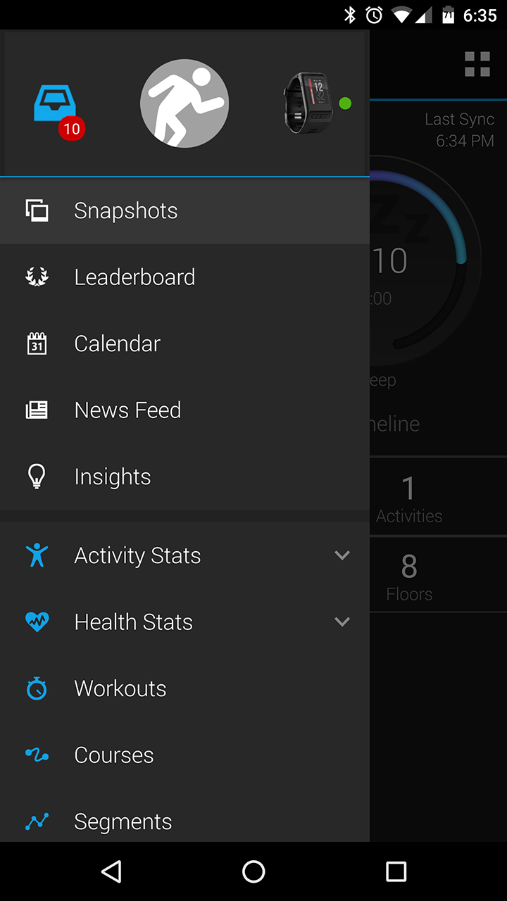 Connect is divided up into a few main sections: Snapshots, Leaderboard, Calendar, News Feed and Insights. The main Snapshot screen features all of your stats for the current day, including steps, sleep, active calories, activities, intensity minutes and floors climbed. Swiping left or right from here will bring you to more detailed pages on steps, sleep, activity, weight, and the Garmin Community. You can also add more Snapshots by tapping the top-right menu button.