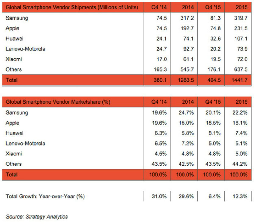 Global smartphone sales hit a record high in 2015, but growth is slowing