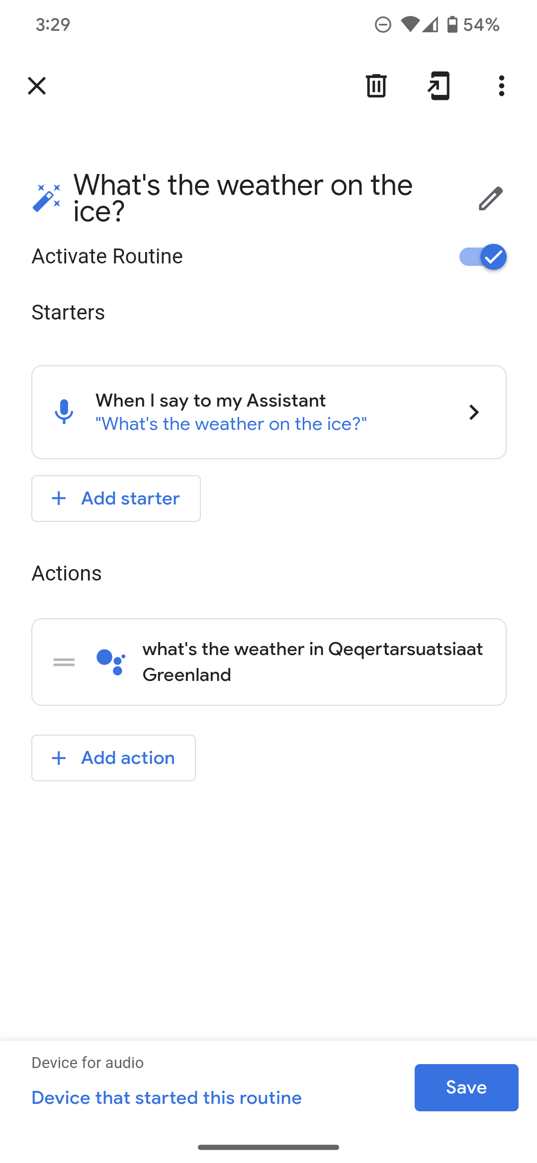 Of course, you can vary the keywords here, from mountain to beach to ice to lake (or use any other triggering sentence you prefer) and insert any town name you often visit in the action component. The trick is in spelling it correctly as Google Search would recognize it.
