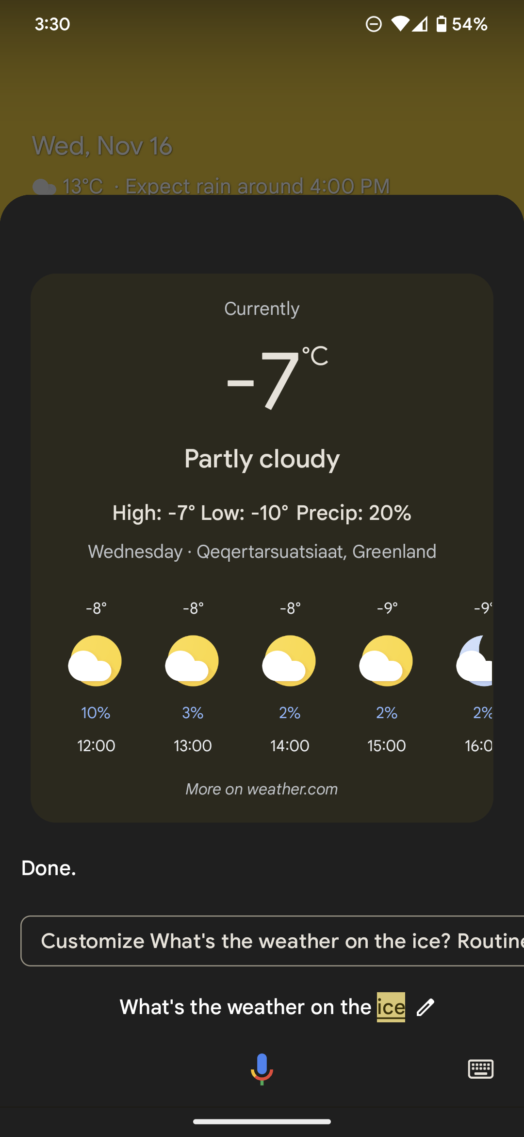 Now, all I need to do is ask Assistant “what’s the weather in the mountain?” and it’ll tell me the weather in Qlayaat. “In the mountain” certainly rolls off the tongue better and the risk of Assistant failing to understand that is super, super low. I even tried the trick with Llanfairpwllgwyngyll in Wales and Qeqertarsuatsiaat in Greenland and it worked in both.
