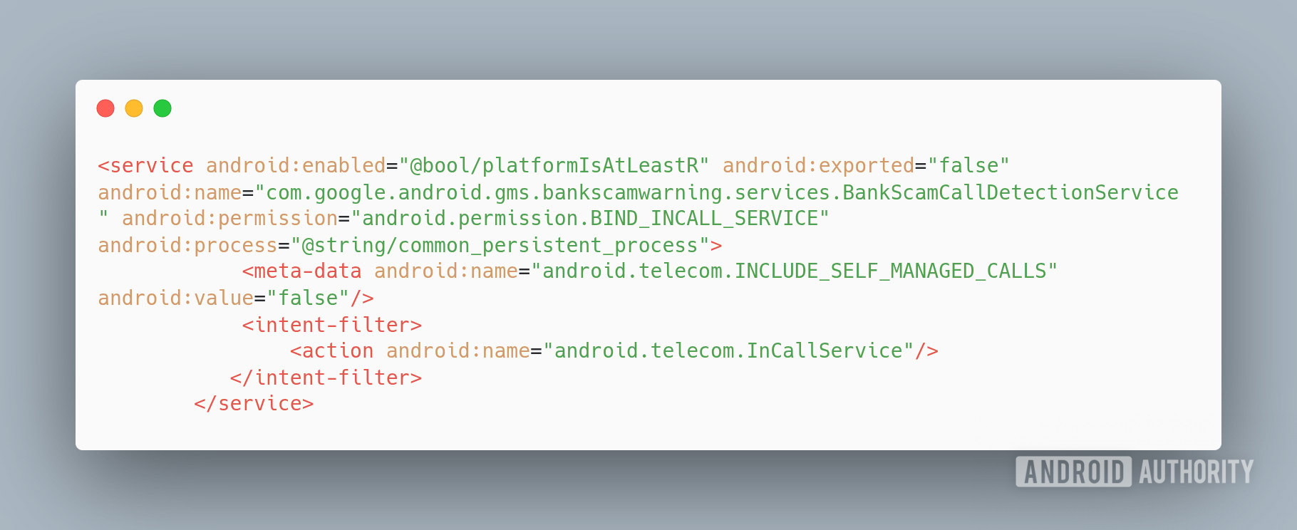 The code snippets above detail how Google will detect these scam calls. The scam detection feature will apparently kick in when someone calls you but they’re not in your contacts list. The feature will then detect whether a banking app is in the foreground during this phone call and whether or not screen sharing (“media projection”) is active. When these conditions are met, Google will warn you that this could be a scam. The company would presumably let you take action, too, like ending the call or marking the number as coming from a scammer.