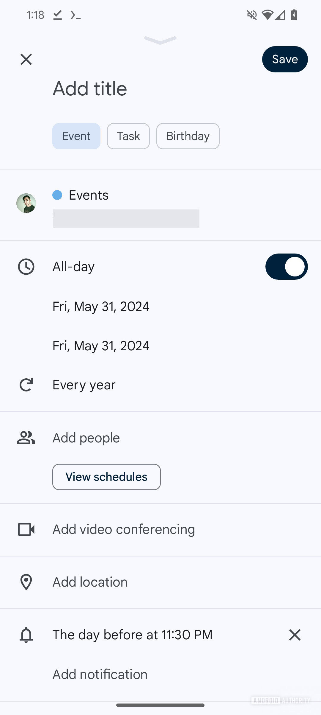 In the latest Google Calendar v2024.21.0-637471596 app update, we managed to activate a dedicated “Birthday” chip that makes it super convenient to add recurring birthday events.