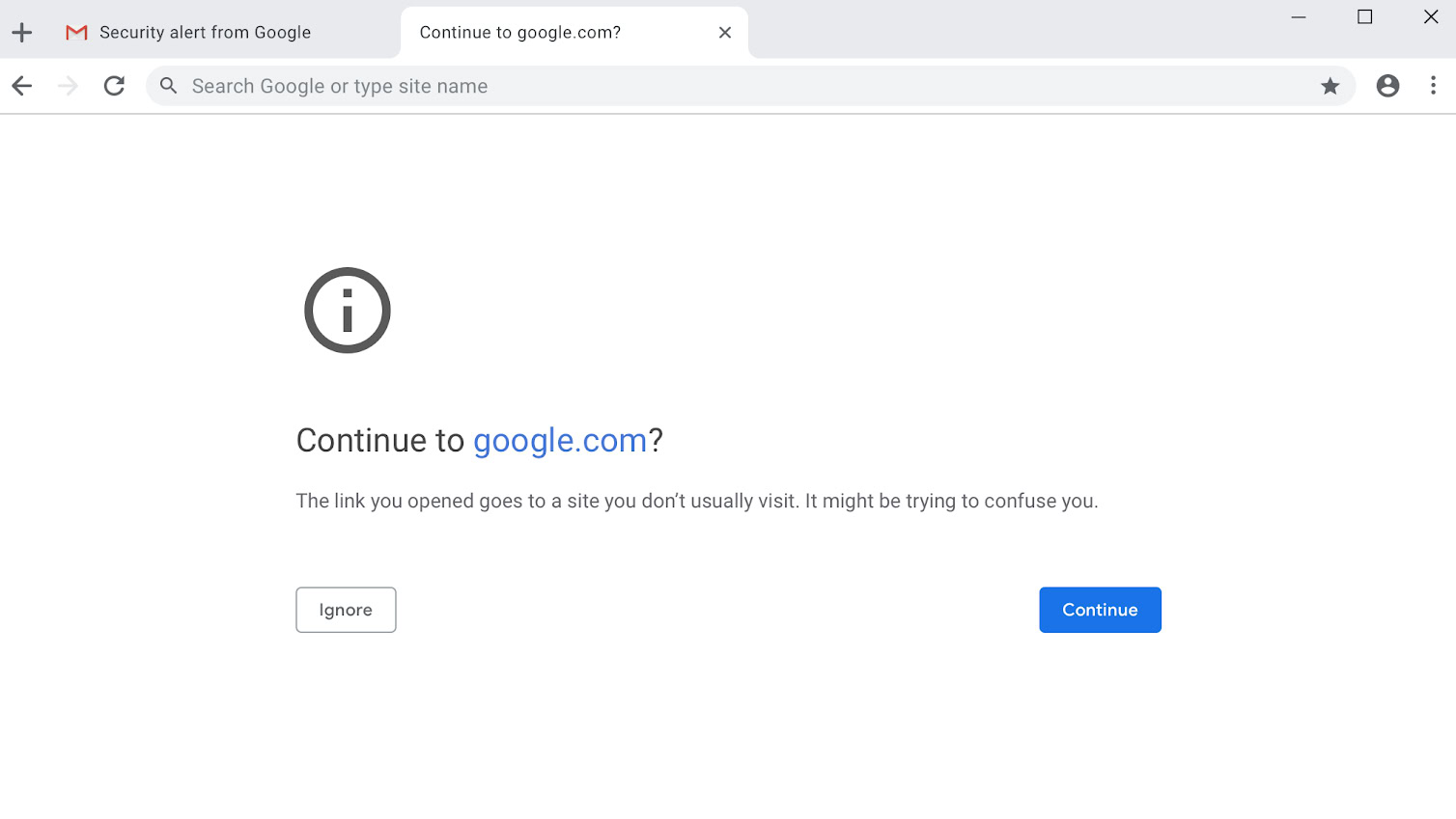 The alert page you see above is what you’ll start to see going forward if this happens. Clicking the blue Continue button will take you to Google, which Chrome will assume is where you wanted to go. You could hit the Ignore button if, for some reason, you really did want to visit www.go0gle.com.