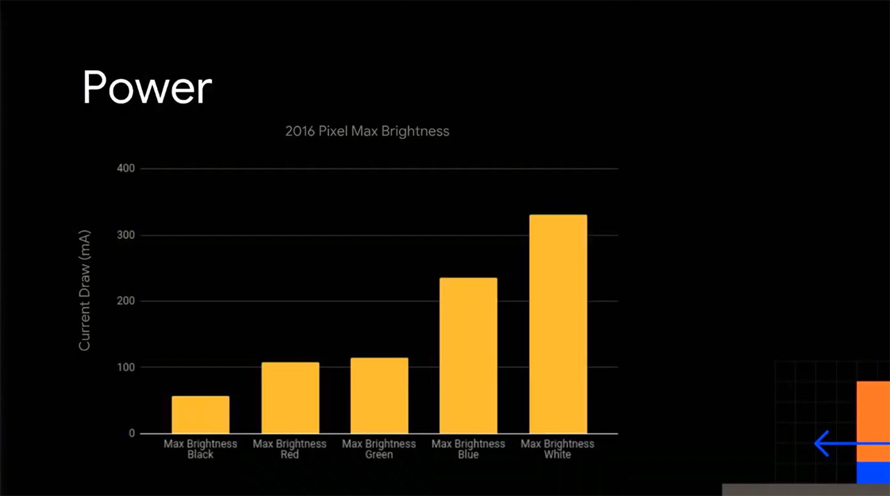 The slideshow (at one hour, 17 minutes, 50 seconds) contained a few “duh” points, such as higher brightness resulting in a higher power draw. Where things picked up a bit was with the next slide, which compared the Google Pixel and iPhone 7’s power draw while on maximum brightness in Normal Mode and Night Mode. Keep in mind that the original Pixel features an OLED display, while the iPhone 7 features an LCD panel.
