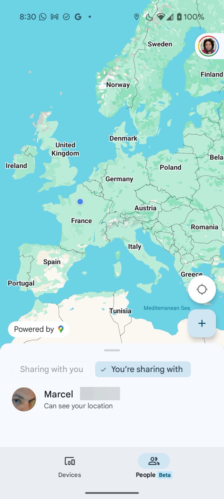 I set up sharing from my phone to my husband’s account and vice-versa, and started testing it out when I went grocery shopping, when he went to work, and when we were both spending a day out in Evreux. We both carry Android phones and the results were as I expected from years of Google Maps location sharing. Our locations were frequently updated, never more than five minutes apart, and throughout several entire days. It works, hoorray!
