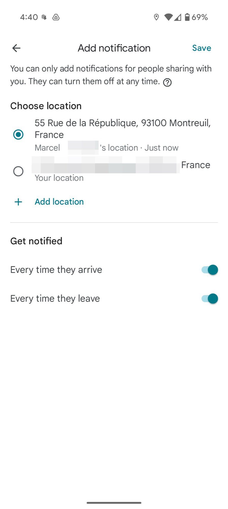 One is the Notifications option. This allows me to create rules and get notified when my husband enters an area or leaves it, like when he reaches work or leaves work. We don’t use this for stalking purposes but for safety reasons. We live alone in a foreign country, so we’re each other’s only real support system in France. Me making sure he’s OK and him making sure I’m OK are essential features in our everyday lives.