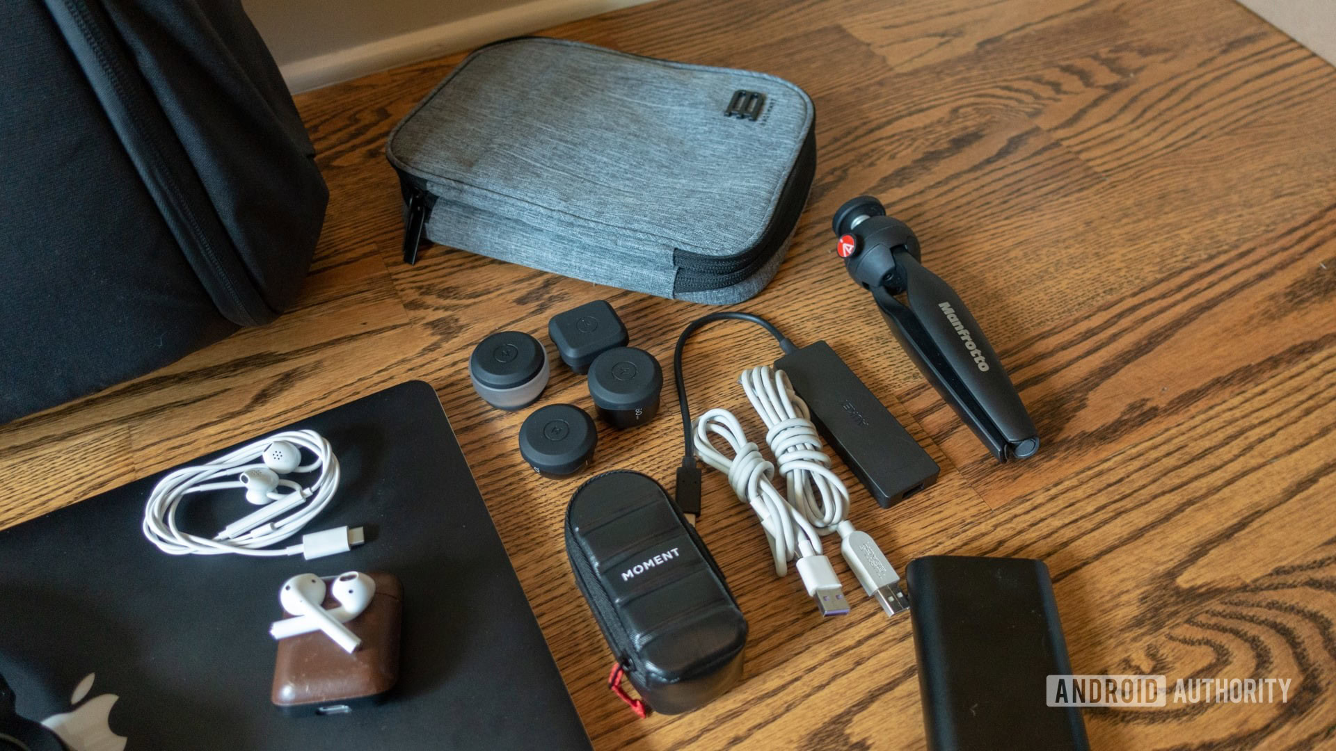 In addition to several types of Anker cables for charging my devices, the case is packed with an AUKEY USB and SD Card adaptor, an Anker PowerCore+ 2100 battery bank, multiple microSD cards for my camera, and other small accessories.