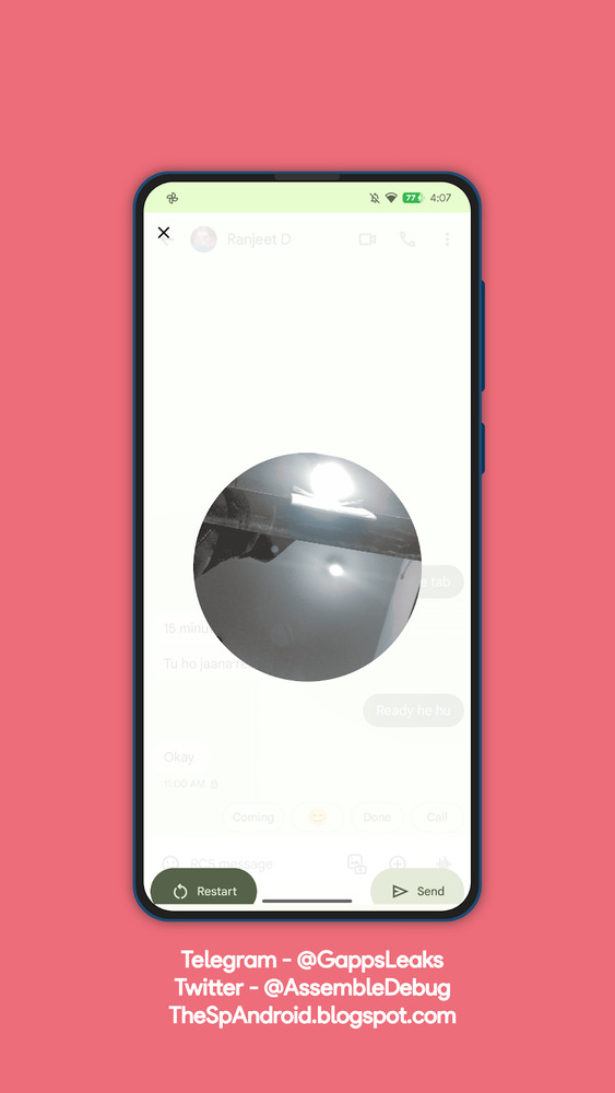 It appears when the feature is activated, a brand new UI with a circular camera frame is brought up. At this moment, you’ll have the option to use your front or back cameras to record a four-second video that can be sent as a GIF to the recipient. There also appears to be a Restart button in case you mess up and want to try again.