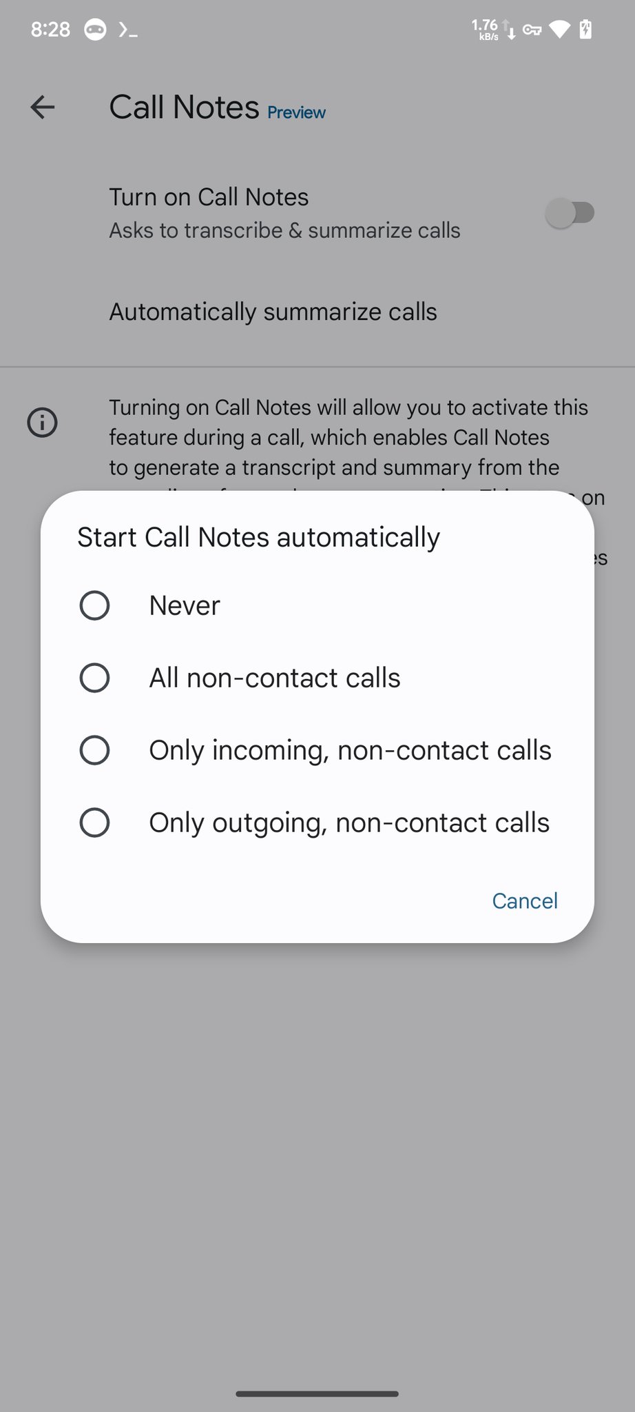Curiously, these options still exist within the Phone by Google app. With Phone v172.0 beta, Google has now tweaked the automatic Call Notes option to Automatic Call Recording, switching from an automatic summary to automatic recording. The options are also now limited to these two: