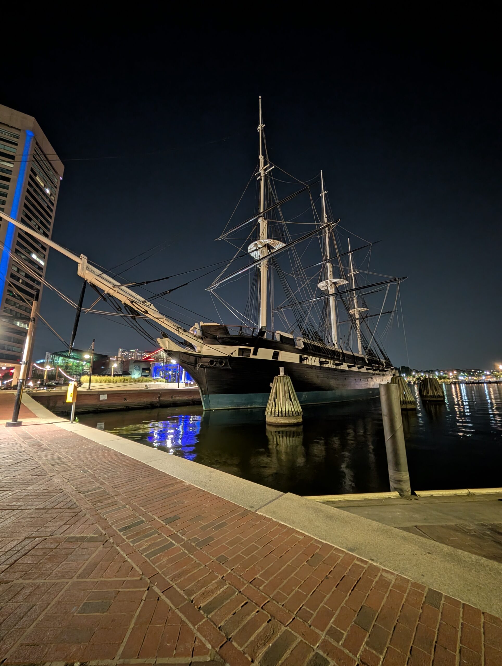 The middle image barely counts as night mode, thanks to the lights of Baltimore’s Inner Harbor, but it does show how far the Tensor G4 can stretch the light it captures. You can easily identify each rope in the rigging, and the black-painted boards on the ship’s side are still distinct despite the dark coloring and even darker water.