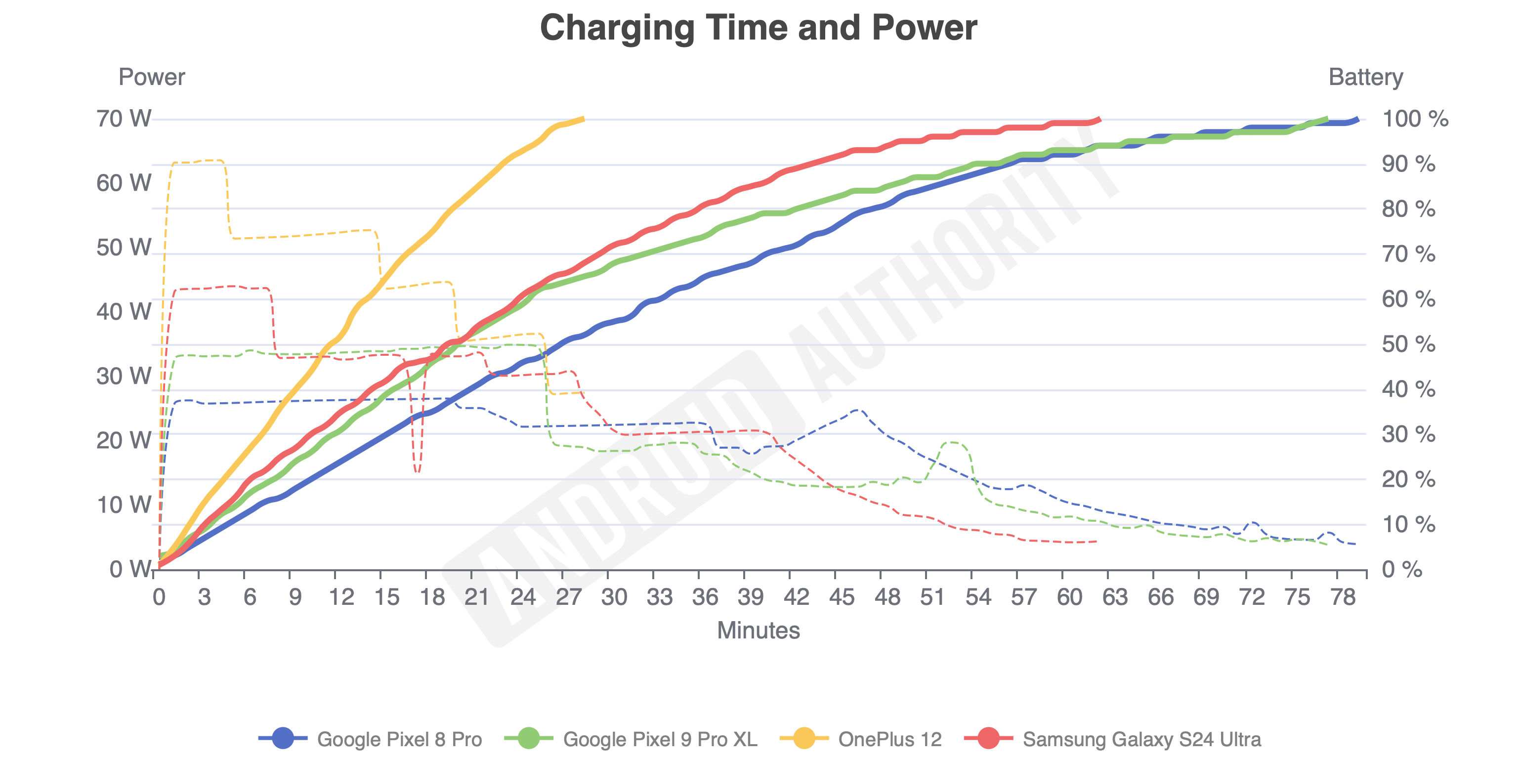 I (incorrectly) assumed that this meant it would work with any old USB PD PPS-enabled charger, so I grabbed my trusty 68W Motorola TurboPower charger — a charger that I previously used to fill the Galaxy S24 Ultra at full power — and found that it wouldn’t go past 27W on the Pixel 9 Pro XL. So, I consulted the powers that be (our resident charging expert, Robert Triggs), snagged a more-than-capable upgrade off Amazon, and charged my Pixel 9 Pro XL a whopping two minutes faster than the Pixel 8 Pro.
