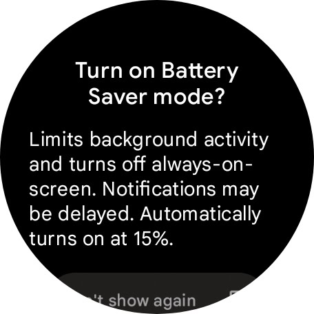 Features like Battery Saver mode should be automatic and seamless, but we found the experience cumbersome on the Pixel Watch 1 and 2 because the mode needed to be enabled manually. When the power gets low enough, you receive a notification that you must actively tap to turn on Battery Saver. Unfortunately, this notification is easy to miss, meaning I was sometimes left with a dead device if I didn’t see my watch’s low-battery alert.