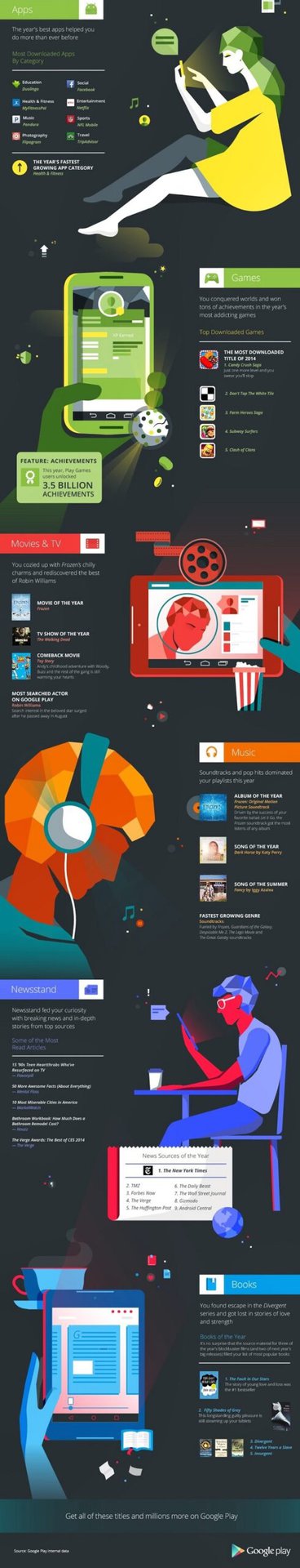 As 2014 comes to a close we’re going to see all sorts of lists that look back at some of the biggest tech innovations of the year, best devices and, of course, the best Google Play apps and services. With the latter of these things in mind, Google has now released a massive infographic that highlights the year’s most popular apps, games, movies/TV, music, books and newstand feeds. The list also mentions that Google Play Games users unlocked 3.5 billion achievements this year.