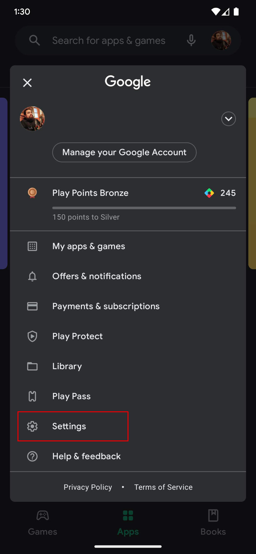 Enable Google Play Store developer options by opening the Google Play Store app, tapping on your profile icon, and selecting Settings. Expand the About section and tap the Play Store Version seven times.