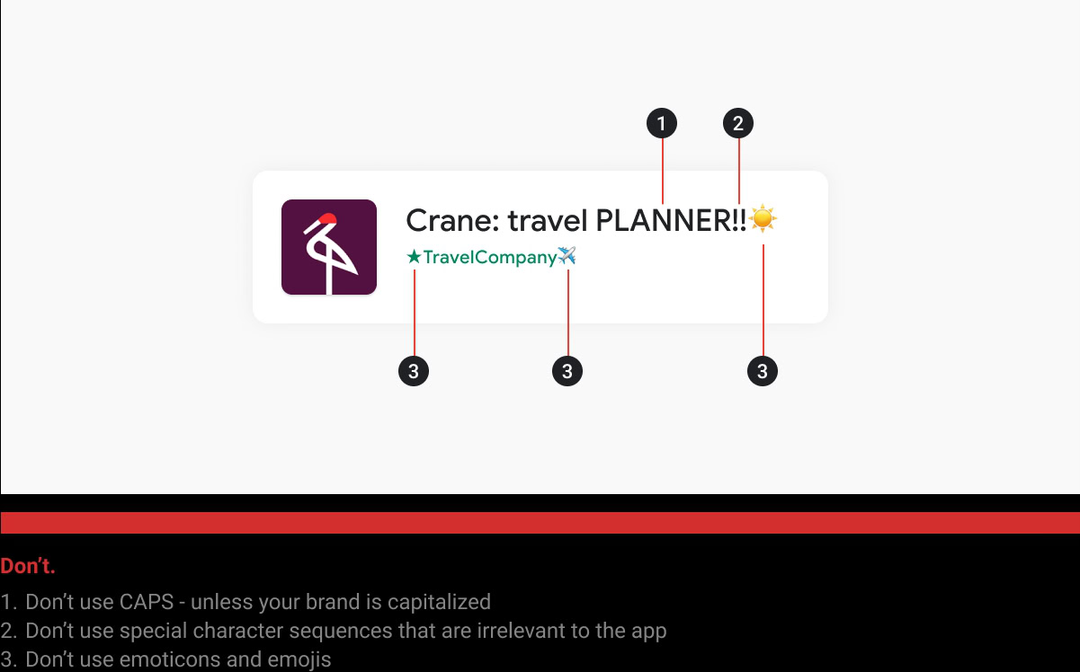 So what are these changes? For starters, app title length will be limited to 30 characters. Titles will also be free of any ranking descriptor or other performance indicators, promotional info, emoticons, or repeated special characters. These rules will also apply to developer titles too. You can see an example of the changes below.