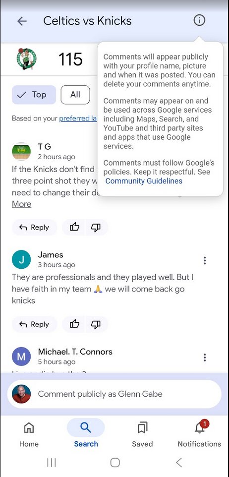 Users can comment through their Google account, which will share their name and profile picture in the discussion thread. Other users can reply to specific comments, and even upvote and downvote comments. Users can filter through the Top comments or show all comments. When you click on a user, you will be taken to the person’s Discussions profile to see their posts.