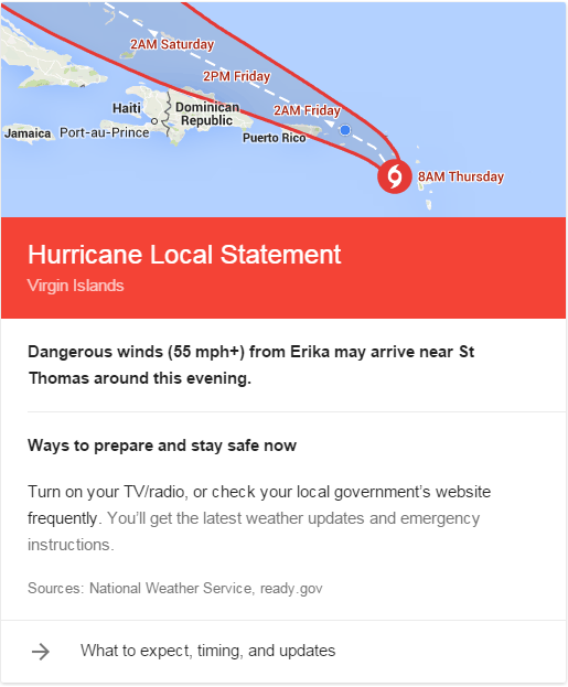 Following the aftermath of Hurricane Katrina ten years ago, Google began ramping up its efforts to display satellite imagery of affected areas in Google Earth and even helped build searchable databases to help people keep in touch with their loved ones. And this hurricane season, Google is making it much easier to track dangerous storms through Search results. The company today announced that it’s bringing some improvements to weather forecasts and Public Alerts in Google Search. With these new improvements, searching for a particular storm or tornado might bring up the following: