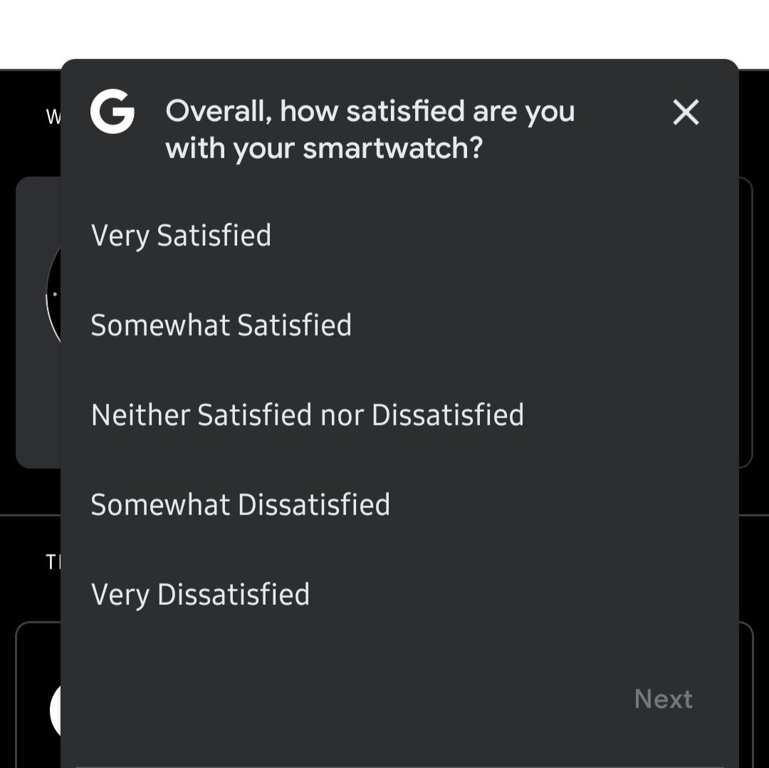 Completion of this first survey then takes you to another Wear OS survey, asking more in-depth questions. These questions cover what type of fitness activities you’re engaged in while wearing the watch, which features you find most important, and details on other smart home gadgets in your household.