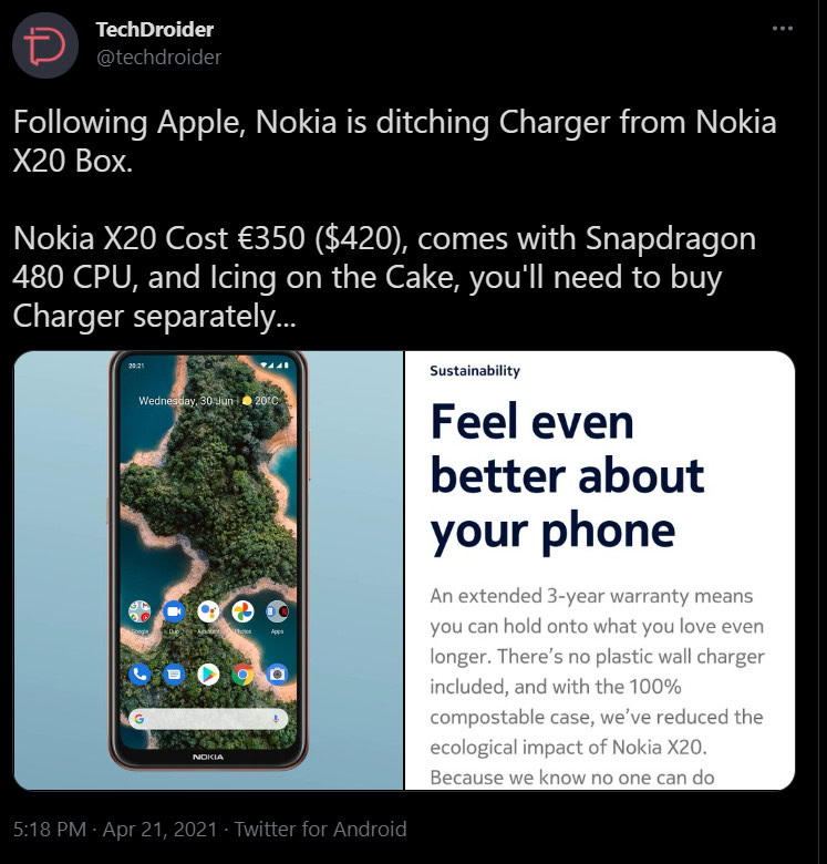 TechDroider (h/t: XDA-Developers) noticed that HMD isn’t including a charger in the box for the Nokia X20 phone. Check out the tweet below.