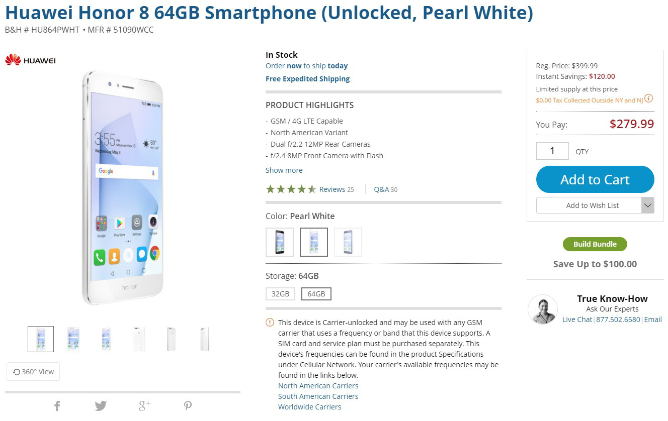 Right now B&H is offering up the 64GB HONOR 8 for just $279.99, the lowest price we’ve ever seen it. The only catch is the white model is the only one at this rock bottom price. Oddly enough, the other colors cost at least $20 to $100 more than the HONOR 8 white variant.