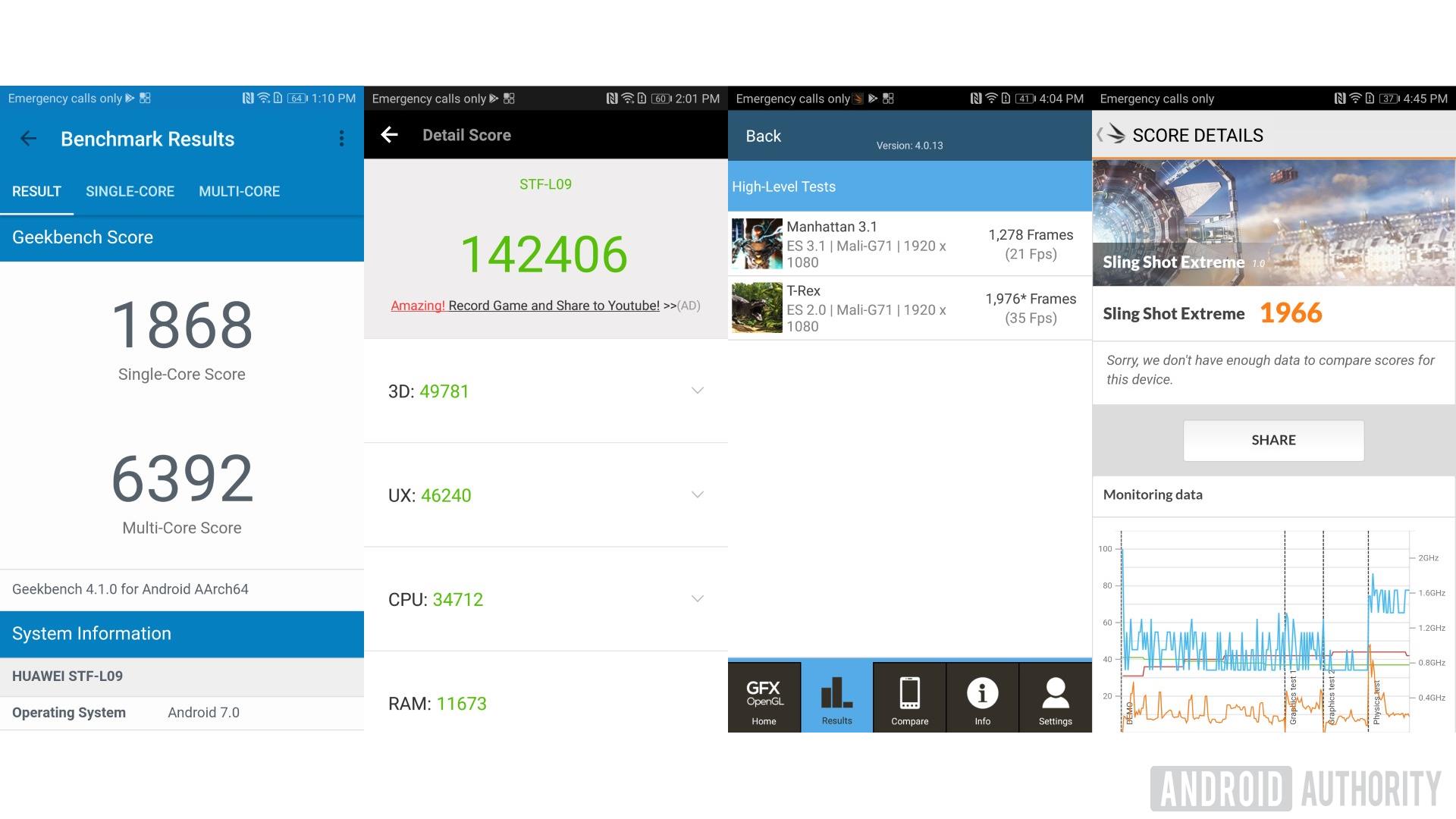 In terms of the benchmarks, the HONOR 9 scored 1868 on Geekbench’s single-core test and 6392 for the multi-core test. As you would expect, these scores are on par with the Mate 9 and the P10. For AnTuTu, the P9 scored 142406, while in Epic Citadel, the device manages 59.0 frames per second in Ultra High Quality mode.