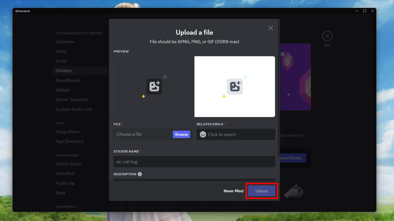 - On the Upload a file window, browse for the sticker you want to upload and fill in the details in the prompted box.
