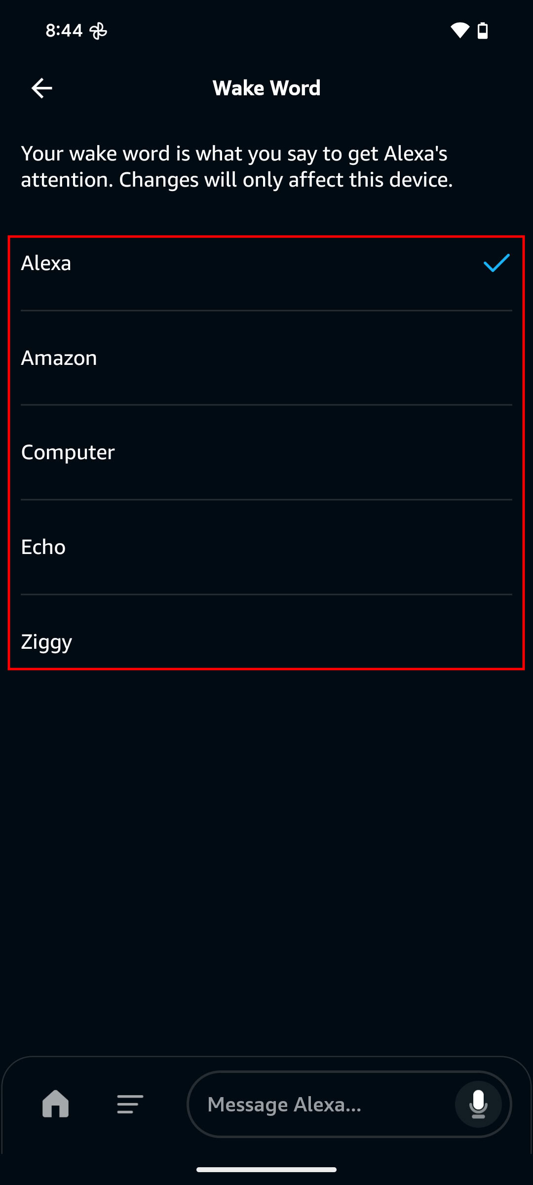 - Select the word you prefer. You can choose between Alexa, Amazon, Computer, Echo, or Ziggy.