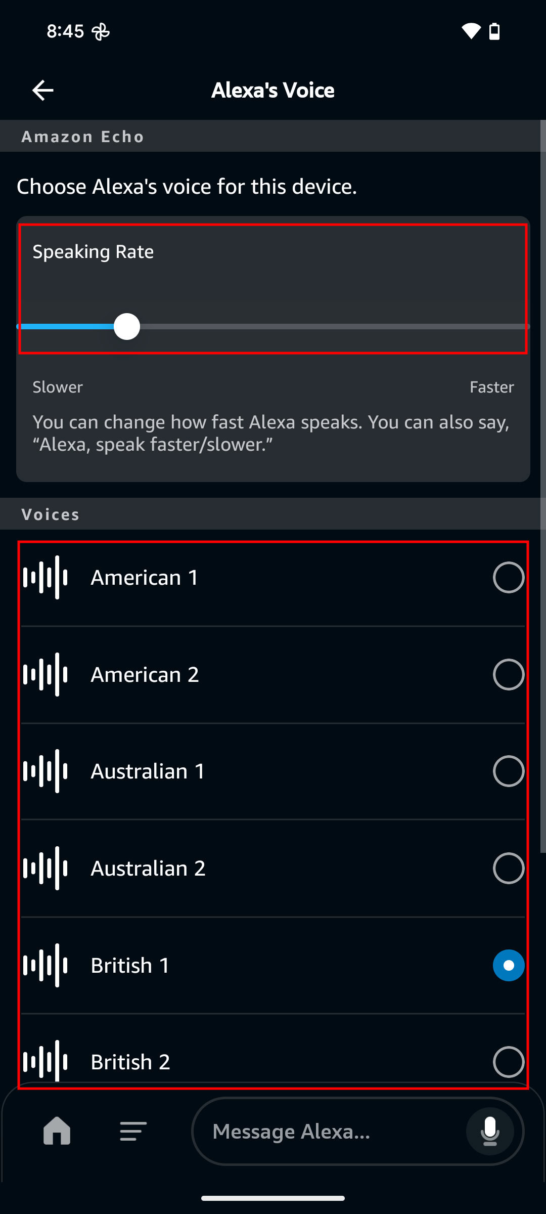 - To flip between male and female voices, or in some cases accents, go back to the Device Settings and tap on Alexa’s Voice. Then, you can select which voice you prefer. Unfortunately, you’ll have to control this on a per-device basis. It’s also possible to adjust the Speaking rate slider if you find Alexa is talking too slowly or quickly.