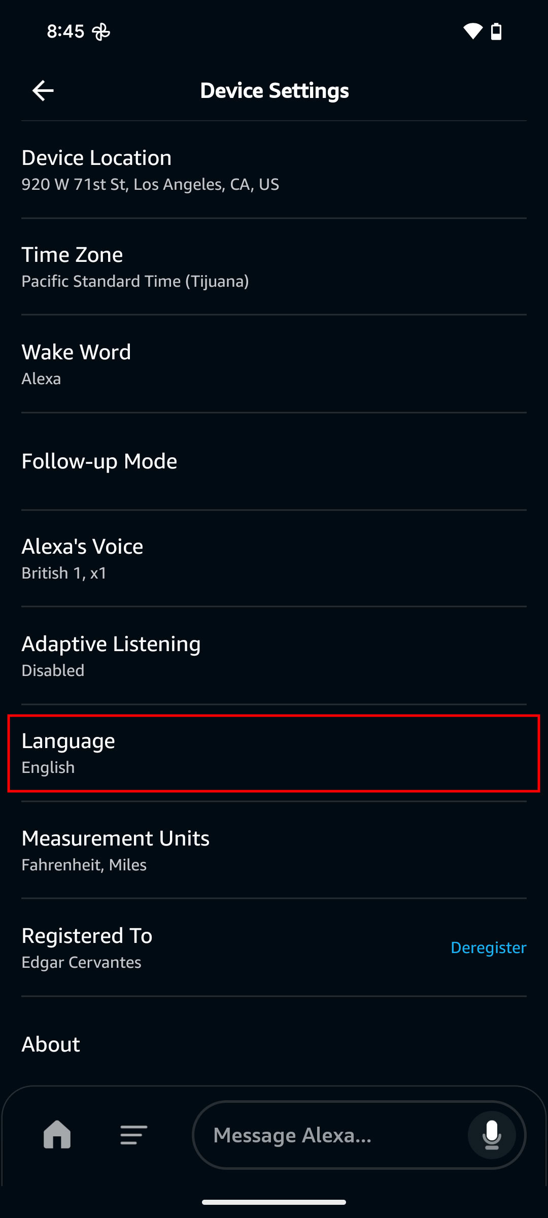 - Go back to the settings and select Language to pick an alternate language or dialect. You can also tap on Alexa's Voice (where available) to switch between male and female personalities, or sometimes different accents.